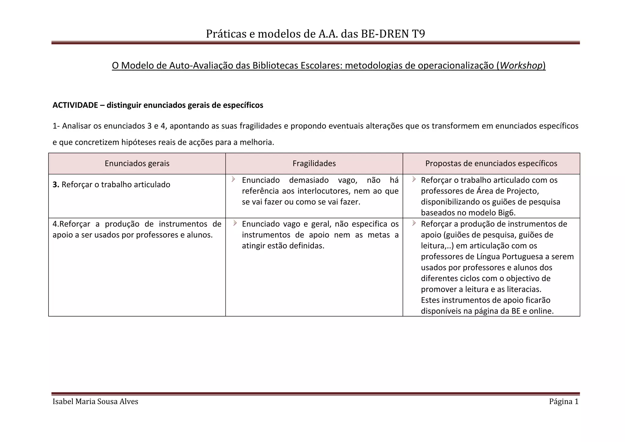 Este documento discute como melhorar as práticas e modelos de auto-avaliação de bibliotecas escolares. Ele analisa dois enunciados gerais e propõe novas versões mais específicas. O primeiro propõe reforçar o trabalho com professores de projeto fornecendo guias de pesquisa baseados em um modelo específico. O segundo propõe produzir mais guias de pesquisa e leitura em colaboração com professores de língua portuguesa para promover leitura em todos os níveis, disponibilizando