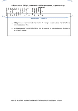 A Biblioteca Escolar (BE) realizou inquéritos junto dos departamentos para avaliar as necessidades da coleção. A BE disponibiliza guiões de pesquisa baseados no modelo Big6 que são frequentemente usados por alunos e professores. A BE promove mecanismos de avaliação dos quais se serve para planificar o trabalho, no entanto, o material informático não está atualizado segundo as necessidades dos utilizadores.