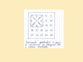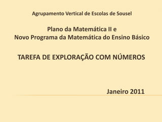 O documento descreve uma tarefa de exploração com números realizada por alunos do 2o e 3o ciclo. Os alunos trabalharam em grupos para explorar padrões em tabelas numéricas. No 2o ciclo, não há resultados detalhados. No 3o ciclo, os alunos observaram que números ímpares nas diagonais têm o mesmo algarismo das unidades e que números pares são pares, e identificaram uma regra para gerar os números adicionando valores da primeira linha e coluna.