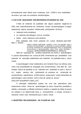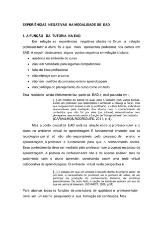 O documento discute experiências negativas na modalidade de educação a distância (EAD). As principais experiências negativas citadas são: 1) problemas na relação entre professores-tutores e alunos, como ausência e falta de interação; 2) uso de materiais de baixa qualidade, como textos complexos e extensos; 3) questões relacionadas ao plágio, como a necessidade de diversificar atividades para evitá-lo.