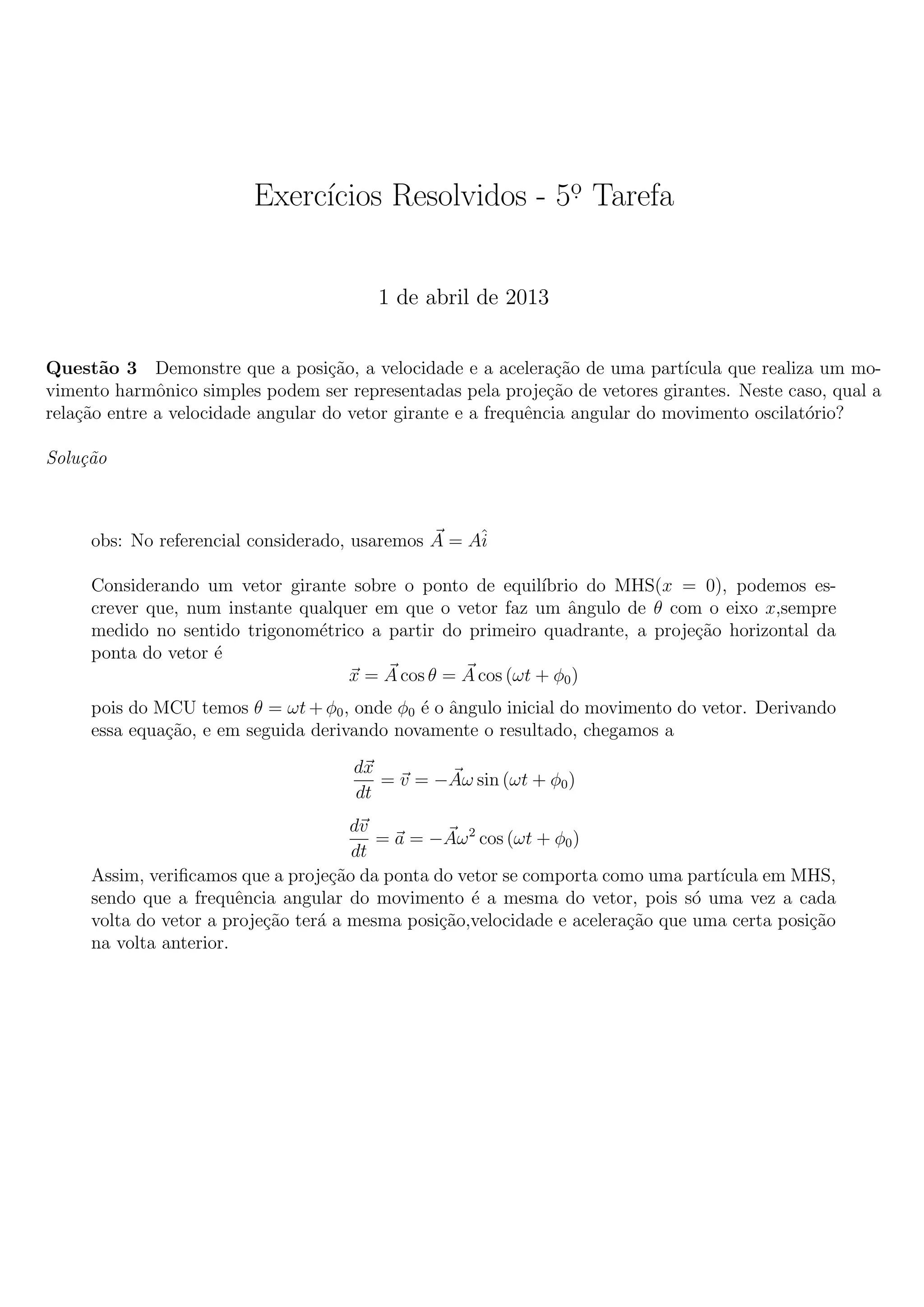 A posição, velocidade e aceleração de uma partícula em movimento harmônico simples podem ser representadas pela projeção de um vetor girante. A velocidade angular do vetor é igual à frequência angular do movimento oscilatório, pois a cada volta do vetor a projeção repete a mesma posição, velocidade e aceleração.