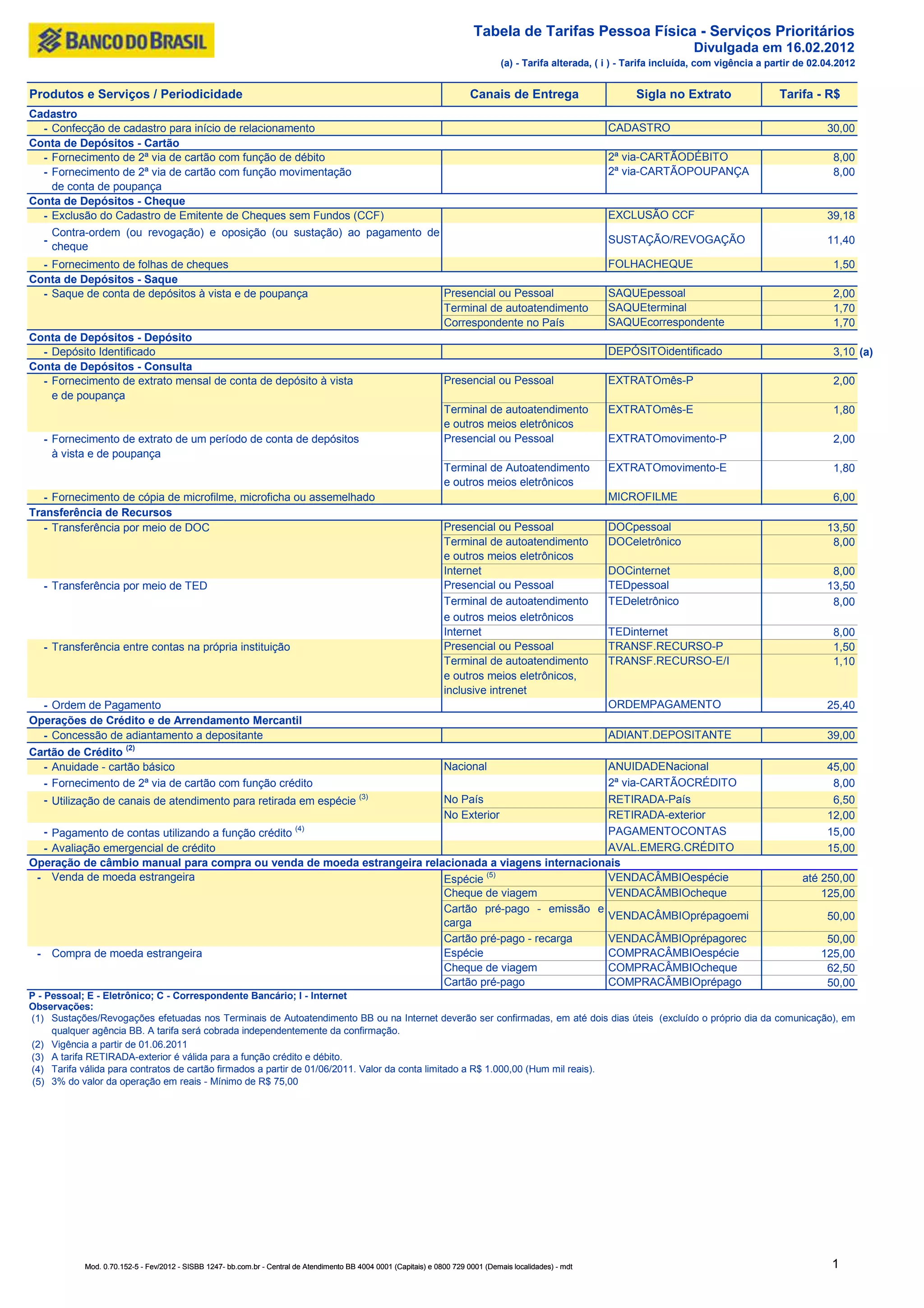 Este documento apresenta uma tabela de tarifas para serviços prioritários de pessoa física, com valores em reais para serviços como cadastro, cartões, saques, depósitos, transferências, operações de crédito e câmbio. Algumas tarifas sofreram alterações e passarão a vigorar a partir de 02 de abril de 2012.