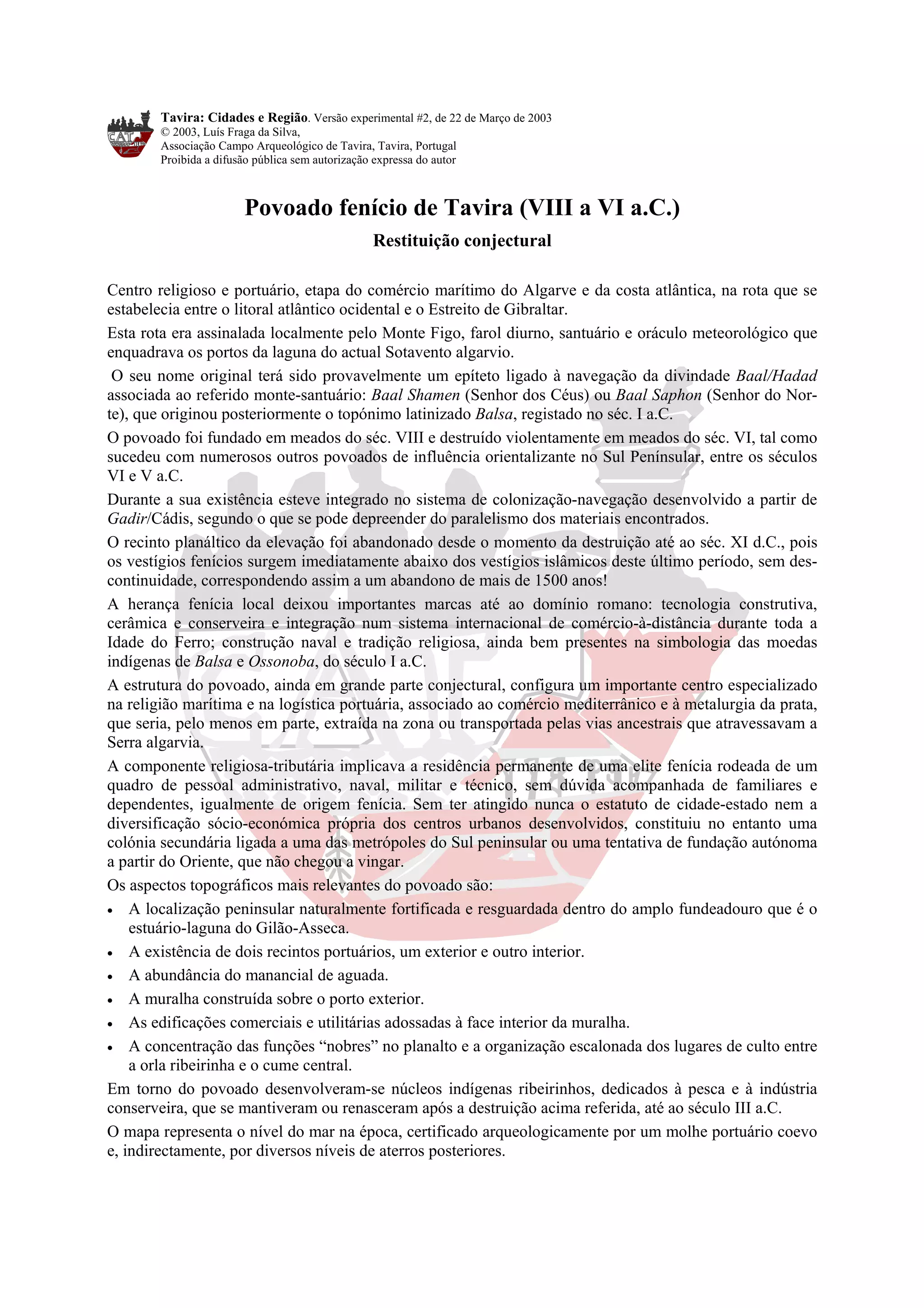 O documento descreve (1) o povoado fenício de Tavira entre os séculos VIII-VI a.C., que serviu como centro religioso e portuário na rota entre o Atlântico e Gibraltar, (2) sua possível destruição no século VI a.C. e abandono até ao século XI d.C., (3) a herança fenícia que perdurou até à dominação romana.