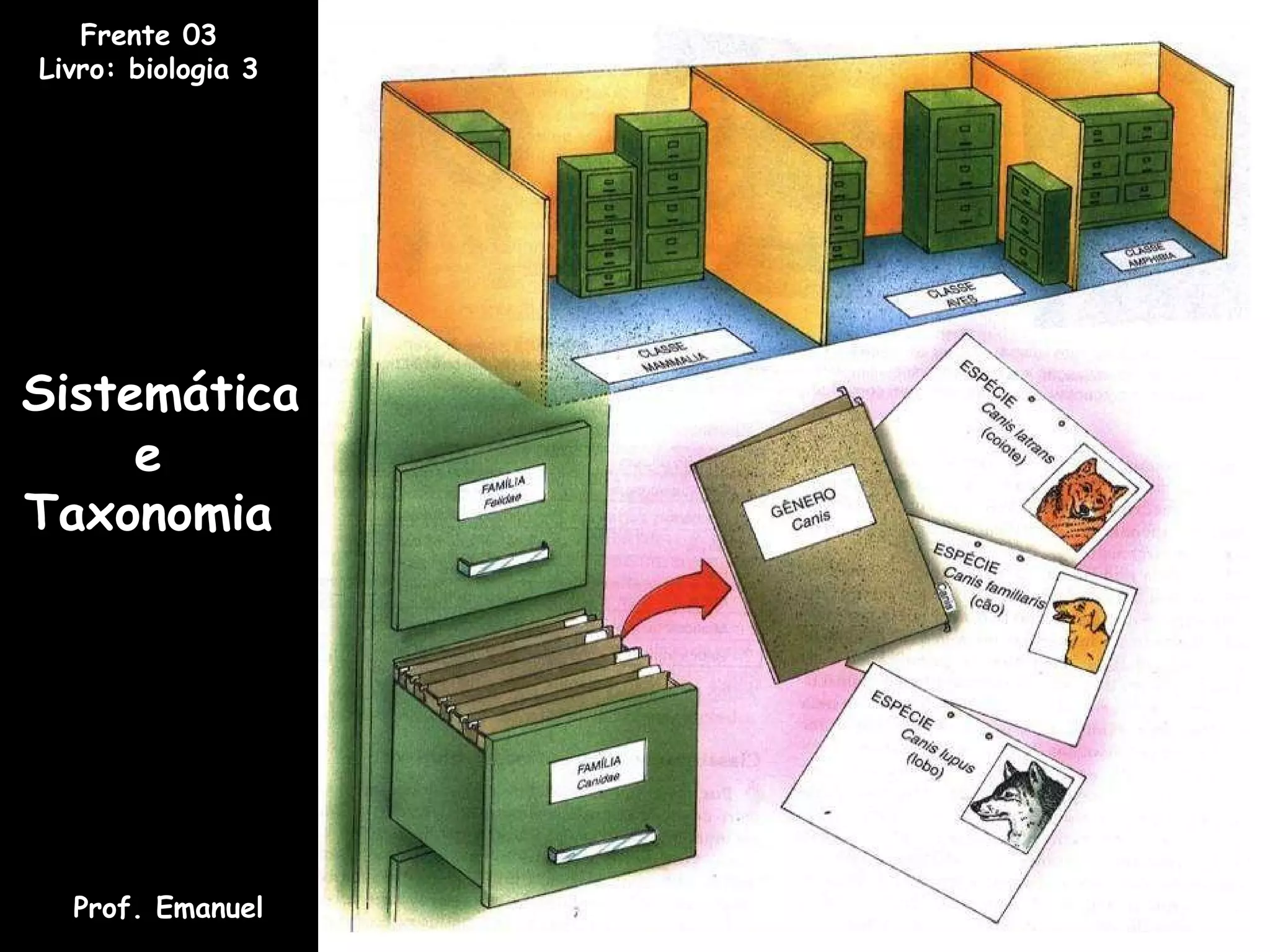 O documento discute sistemas de classificação biológica e taxonomia. Apresenta os principais métodos de classificação como classificação artificial, classificação natural e cladística. Também descreve as principais categorias taxonômicas como reino, filo, classe etc. E explica a evolução dos sistemas de classificação ao longo do tempo, desde Lineu até Woese, com a introdução dos três domínios da vida: Archaea, Bactérias e Eucariotos.