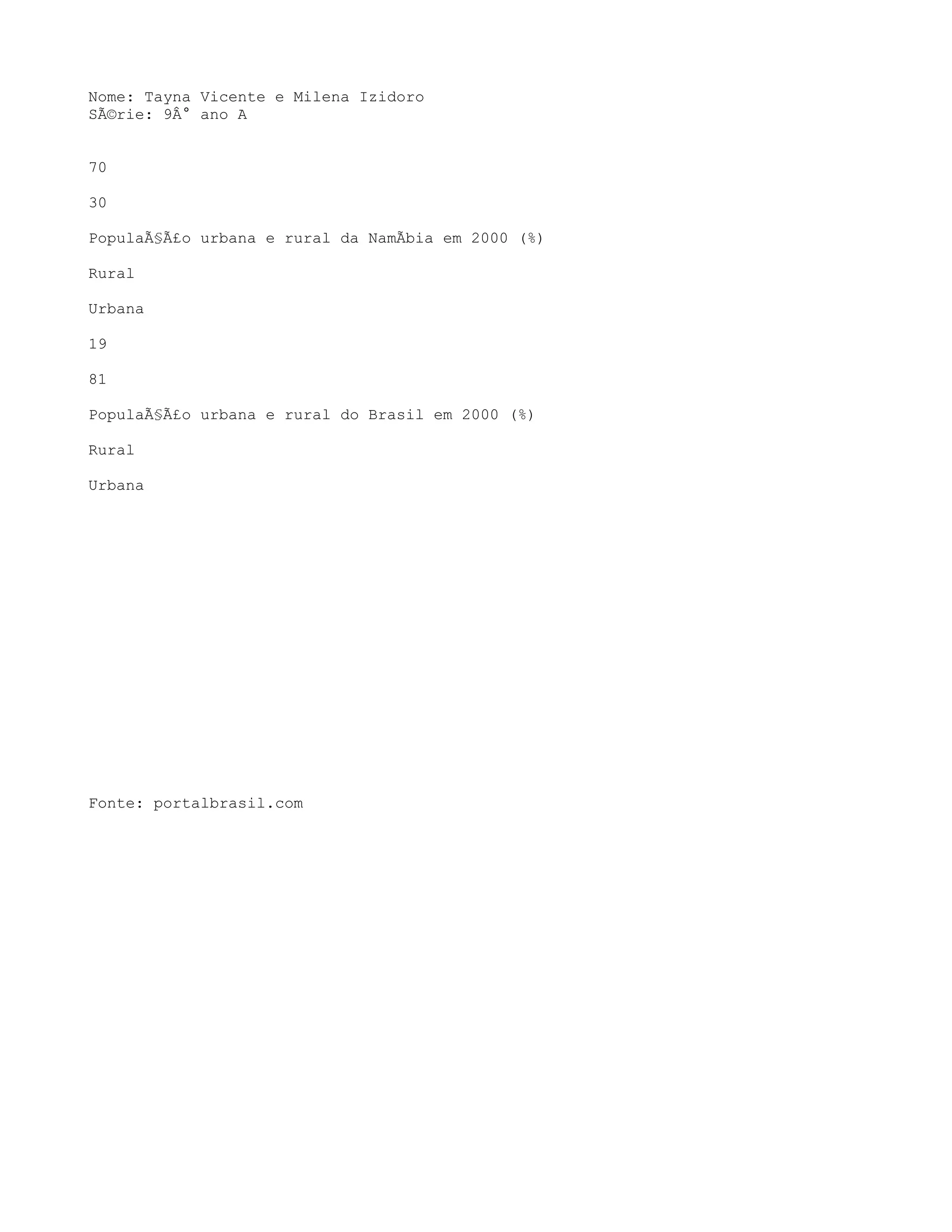 Os gráficos comparam dados demográficos e de expectativa de vida do Brasil e Namíbia em 2000, mostrando que a Namíbia tinha uma população mais rural e menor expectativa de vida, enquanto o Brasil tinha uma população mais urbana e maior expectativa de vida.