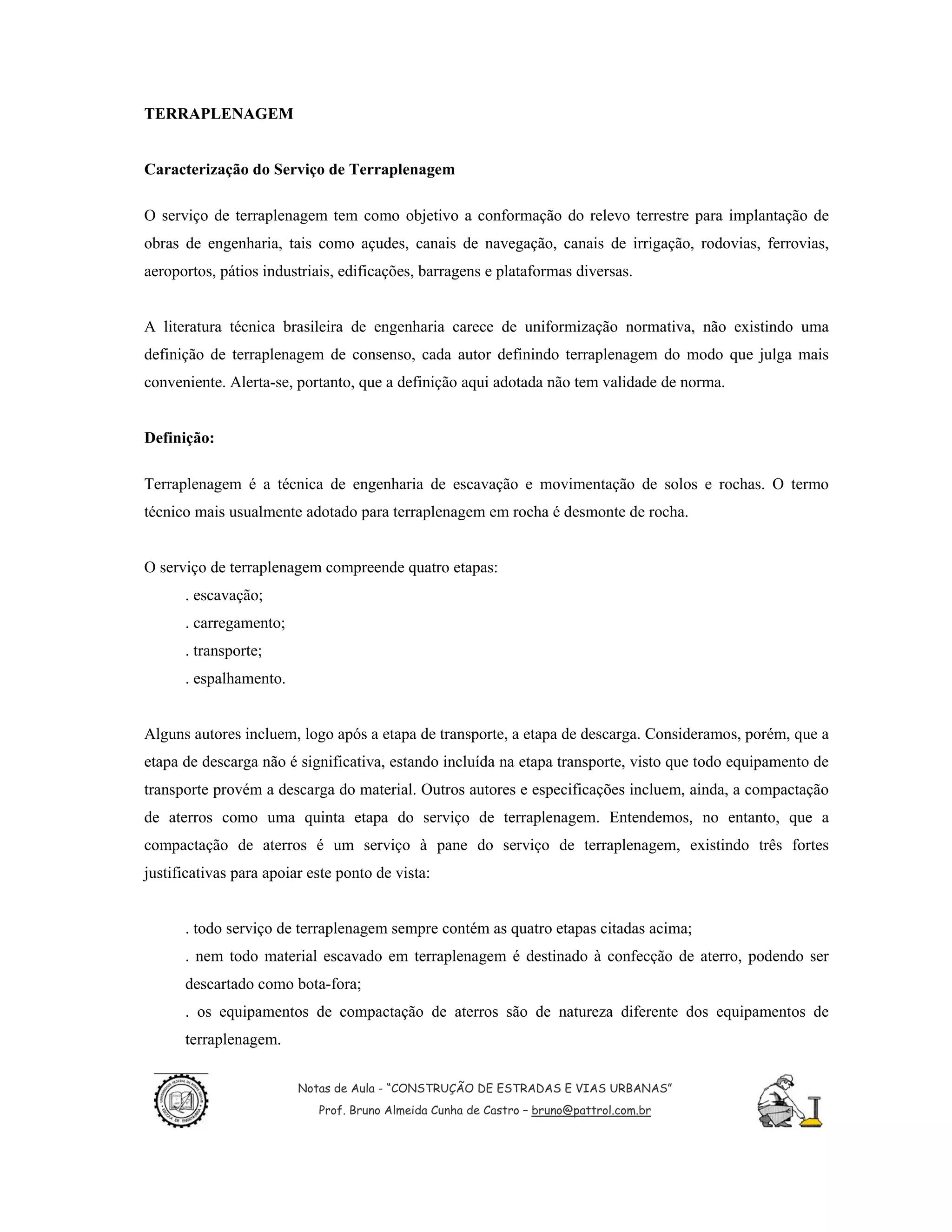 O documento descreve o serviço de terraplenagem, que envolve a conformação do terreno através de escavação e movimentação de solos e rochas. O serviço compreende quatro etapas principais: escavação, carregamento, transporte e espalhamento do material. Além disso, requer atividades preliminares como abertura de caminhos de acesso, desmatamento e implantação de bueiros antes da execução da terraplenagem.