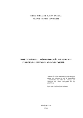 Este relatório analisa a estratégia de marketing digital e gestão de conteúdo da academia Fast Fit entre 2014-2015. O documento descreve a academia, apresenta uma análise SWOT, revisa conceitos teóricos de marketing e administração, caracteriza o mercado, faz um diagnóstico organizacional e fornece recomendações. O objetivo é avaliar as estratégias digitais da Fast Fit para atrair e impactar clientes durante esse período.