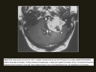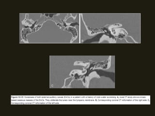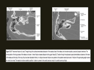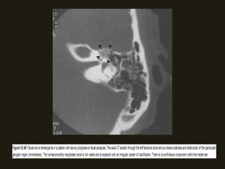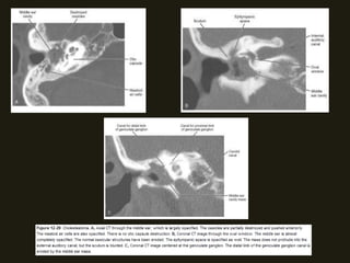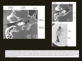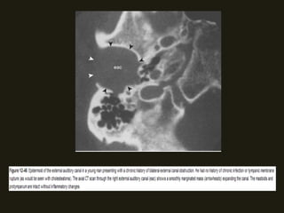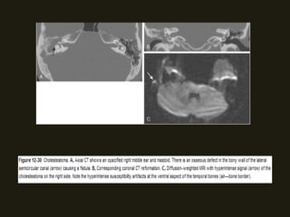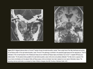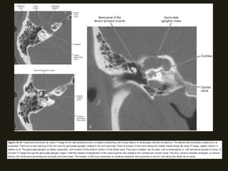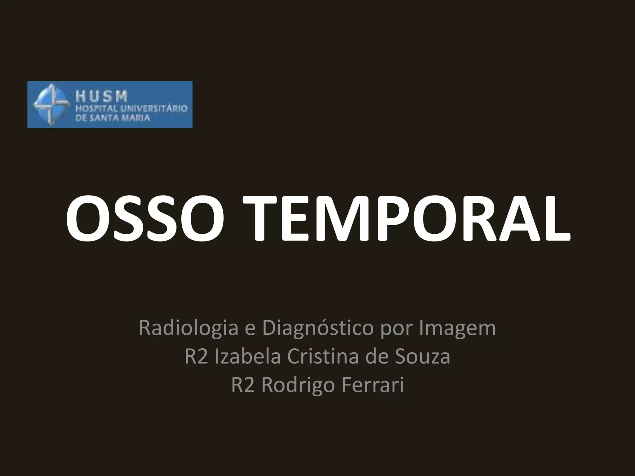 Este documento descreve a anatomia do osso temporal, incluindo a cavidade timpânica, os ossículos da audição, o canal auditivo interno e a orelha interna. Também discute as principais técnicas de imagem como TC e RM para avaliar o osso temporal e apresenta exemplos de malformações congênitas, lesões inflamatórias e neoplasias que podem acometer esta região.