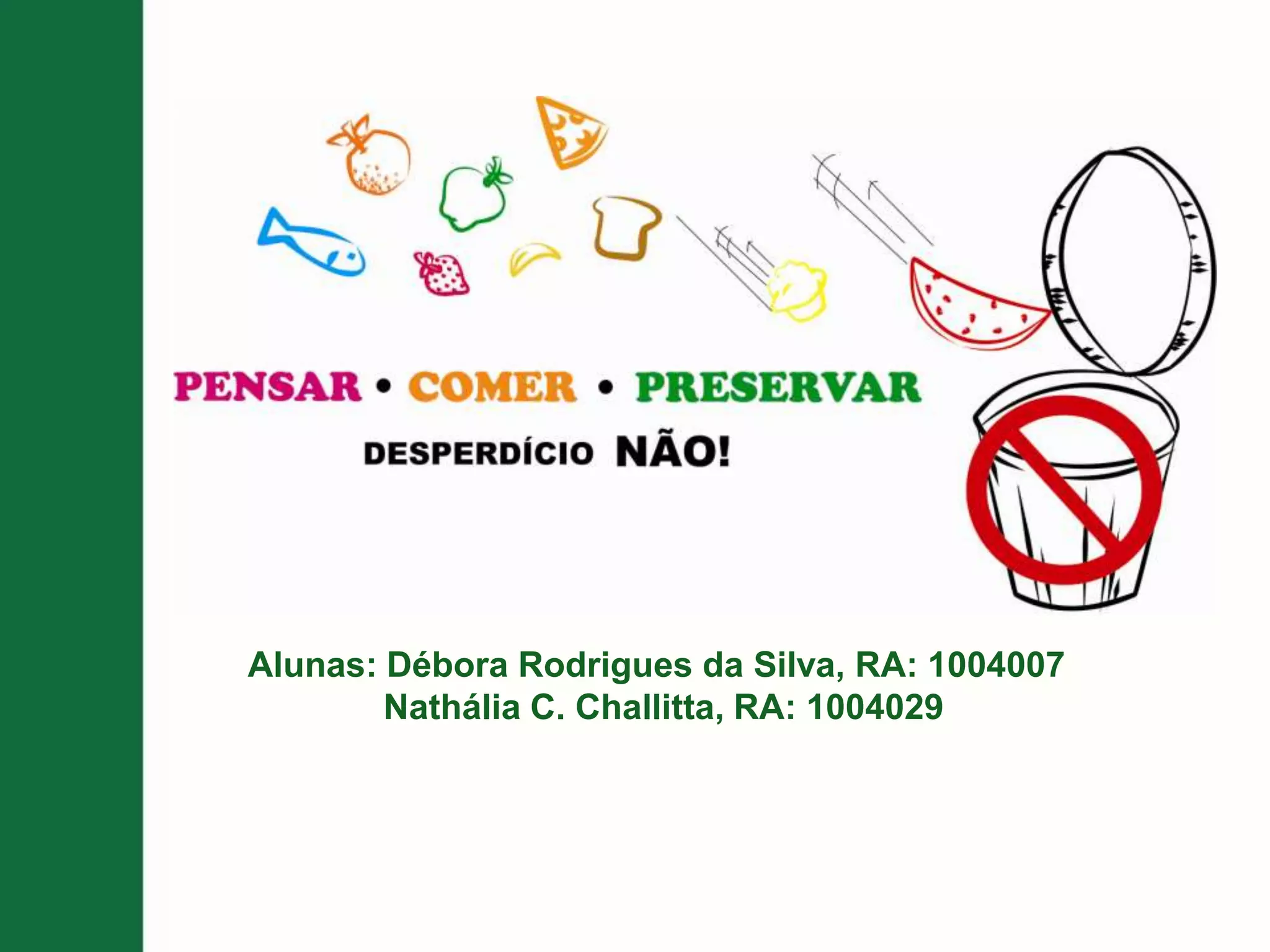 O documento discute o problema do desperdício de alimentos no Brasil e no mundo. Metade da comida produzida no mundo é desperdiçada. No Brasil, 20% dos alimentos são desperdiçados na colheita, 8% no transporte, 15% na indústria, 1% no varejo e 30% por não atenderem padrões estéticos. O desperdício ocorre por despreparo de quem trabalha na agroindústria e dos consumidores.
