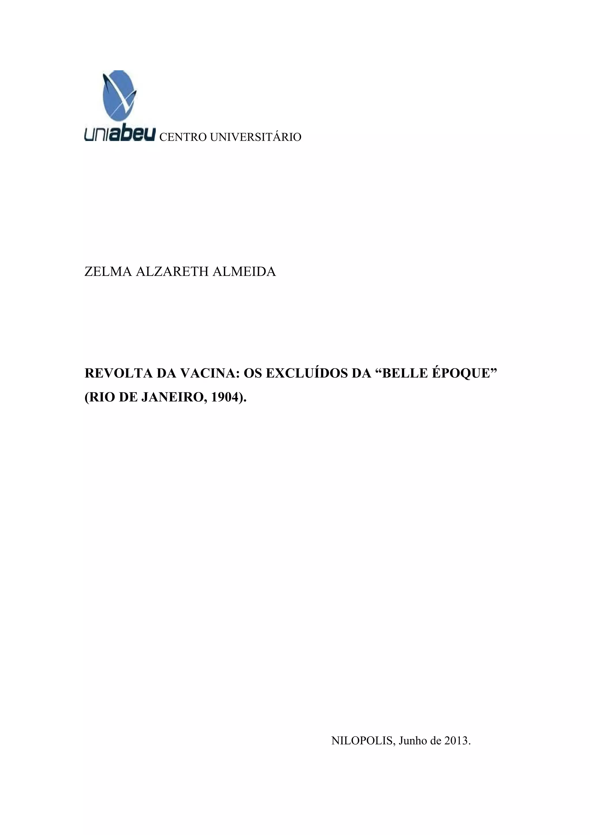 1. O documento apresenta um projeto de pesquisa sobre a Revolta da Vacina de 1904 no Rio de Janeiro.
