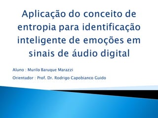 Este documento descreve um trabalho sobre identificação de emoções em áudio usando parâmetros de entropia extraídos de amostras de voz. O documento discute os conceitos, métodos de extração de características, classificação proposta e testes realizados para identificar seis emoções primárias com taxas de acerto entre 5-85%.