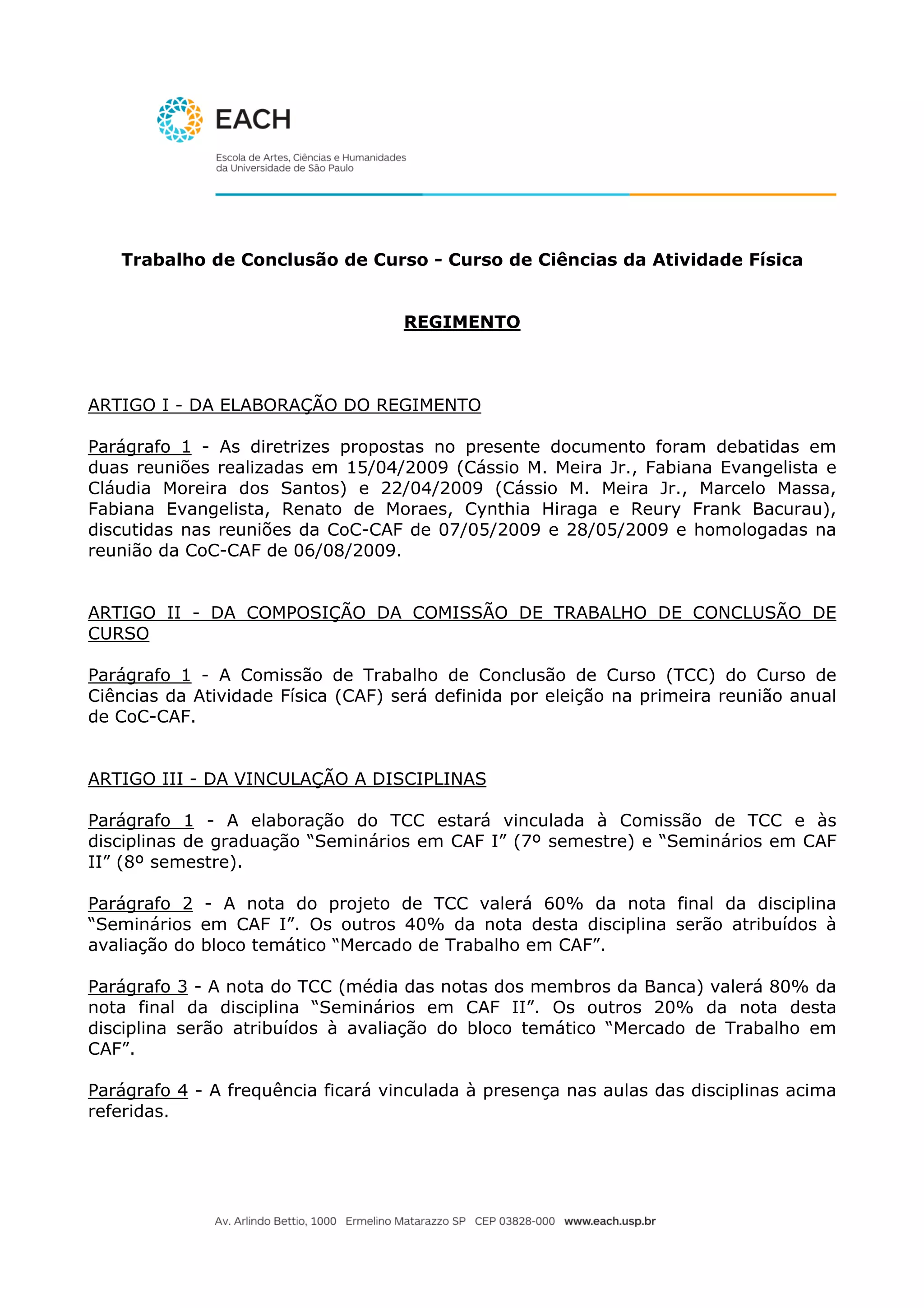 Este documento estabelece as diretrizes para a elaboração do Trabalho de Conclusão de Curso (TCC) do curso de Ciências da Atividade Física da Escola de Educação Física e Esporte da USP. Ele define a composição da comissão do TCC, sua vinculação a disciplinas, apresentação, orientação, avaliação e gestão.