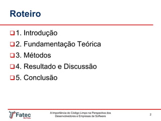 O documento discute a importância do código limpo para desenvolvedores e empresas de software, destacando que sua adoção resulta em melhor qualidade de código, menor quantidade de bugs, e maior satisfação dos clientes. As técnicas para escrever código limpo são analisadas, assim como suas vantagens em termos de manutenibilidade e produtividade. O estudo também aponta que o código ruim pode levar a custos maiores e até à falência das empresas.
