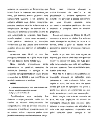 O documento discute a arquitetura orientada a serviços (SOA) e sistemas de gerenciamento de regras de negócio (BRMS). BRMS permite que usuários de negócios criem e modifiquem regras sem a necessidade de programação, reduzindo custos e melhorando a adaptação a regras dinâmicas. O documento também explica como as regras são representadas em BRMS e como fluxos de trabalho podem orquestrar sequências de regras.