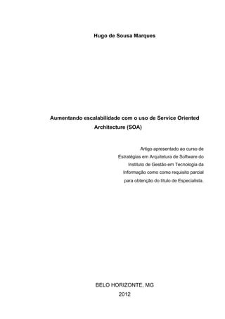 O trabalho de Hugo de Sousa Marques analisa o aumento da escalabilidade em sistemas de software através da implementação da arquitetura orientada a serviços (SOA). O artigo apresenta conceitos fundamentais de SOA, define escalabilidade de software e explora tecnologias que contribuem para a escalabilidade, como shared nothing architecture e cloud computing. O estudo conclui que a adoção de SOA e seus princípios de design pode mitigar problemas típicos de escalabilidade em sistemas complexos.