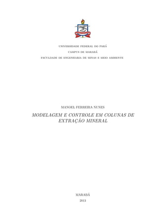 Este documento apresenta o Trabalho de Conclusão de Curso de Manoel Ferreira Nunes sobre modelagem e controle em colunas de extração mineral. O trabalho propõe um modelo matemático para prever a altura ótima do fluido na coluna de lixiviação de minério de cobre oxidado, visando otimizar o processo de extração. O documento discute conceitos de modelos matemáticos, filtração, escoamentos e transformadas de Laplace aplicadas ao desenvolvimento do modelo proposto.
