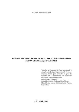 Este documento apresenta uma análise das estruturas de ação para aprendizagem utilizadas pela empresa NECON Organização Contábil. O trabalho caracteriza a empresa, aplica um instrumento de coleta de dados sobre estruturas de ação para aprendizagem com os gestores da NECON e analisa os dados coletados. Conclui-se que a empresa faz uso de algumas estruturas como resolver problemas de forma sistêmica, experimentar abordagens de trabalho, transferir conhecimento e fornecer suporte ao ambiente de aprendizagem. Sugestões para melhorar