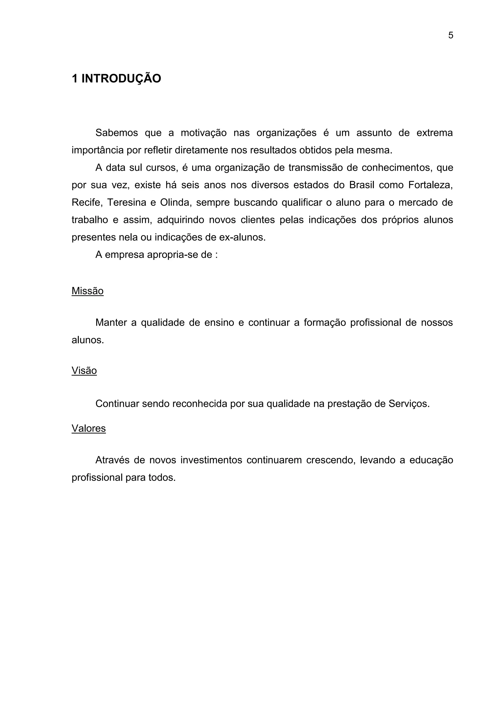 O documento discute a motivação dos funcionários da empresa Data Sul Cursos. Ele apresenta uma introdução sobre a importância da motivação, objetivos do estudo, justificativa e referencial teórico. Foi aplicado um questionário com funcionários que mostrou que a maioria se sente desmotivada por falta de investimento da empresa em capacitação, feedbacks, interação social e benefícios. O documento conclui que a empresa precisa melhorar a motivação para reter talentos e melhorar os resultados.
