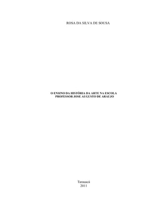 Este documento resume um trabalho de conclusão de curso sobre o ensino da história da arte na Escola Municipal Professor José Augusto de Araújo. A pesquisa investigou como é ministrada a disciplina de arte nas séries do 6o ao 9o ano através de entrevistas com coordenadores, professores e alunos. O trabalho buscou identificar a metodologia utilizada e refletir sobre a importância do ensino artístico na formação dos estudantes.