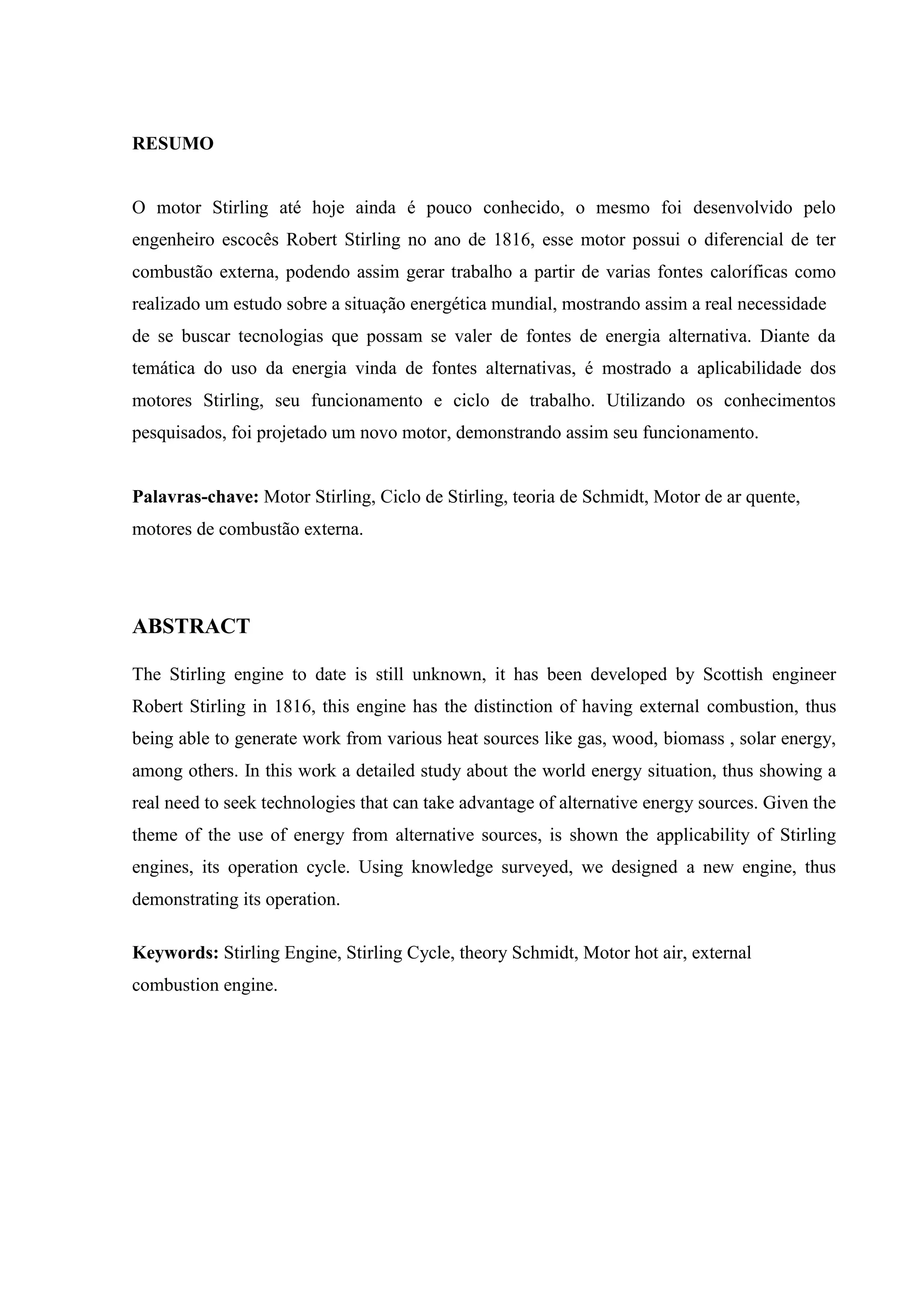 O documento discute o motor Stirling, desenvolvido em 1816 para gerar trabalho a partir de várias fontes de calor. Explica que o motor tem combustão externa e pode usar fontes como biomassa e energia solar. Também aborda a necessidade de buscar tecnologias de energia alternativa diante da situação energética mundial e mostra a aplicabilidade dos motores Stirling.