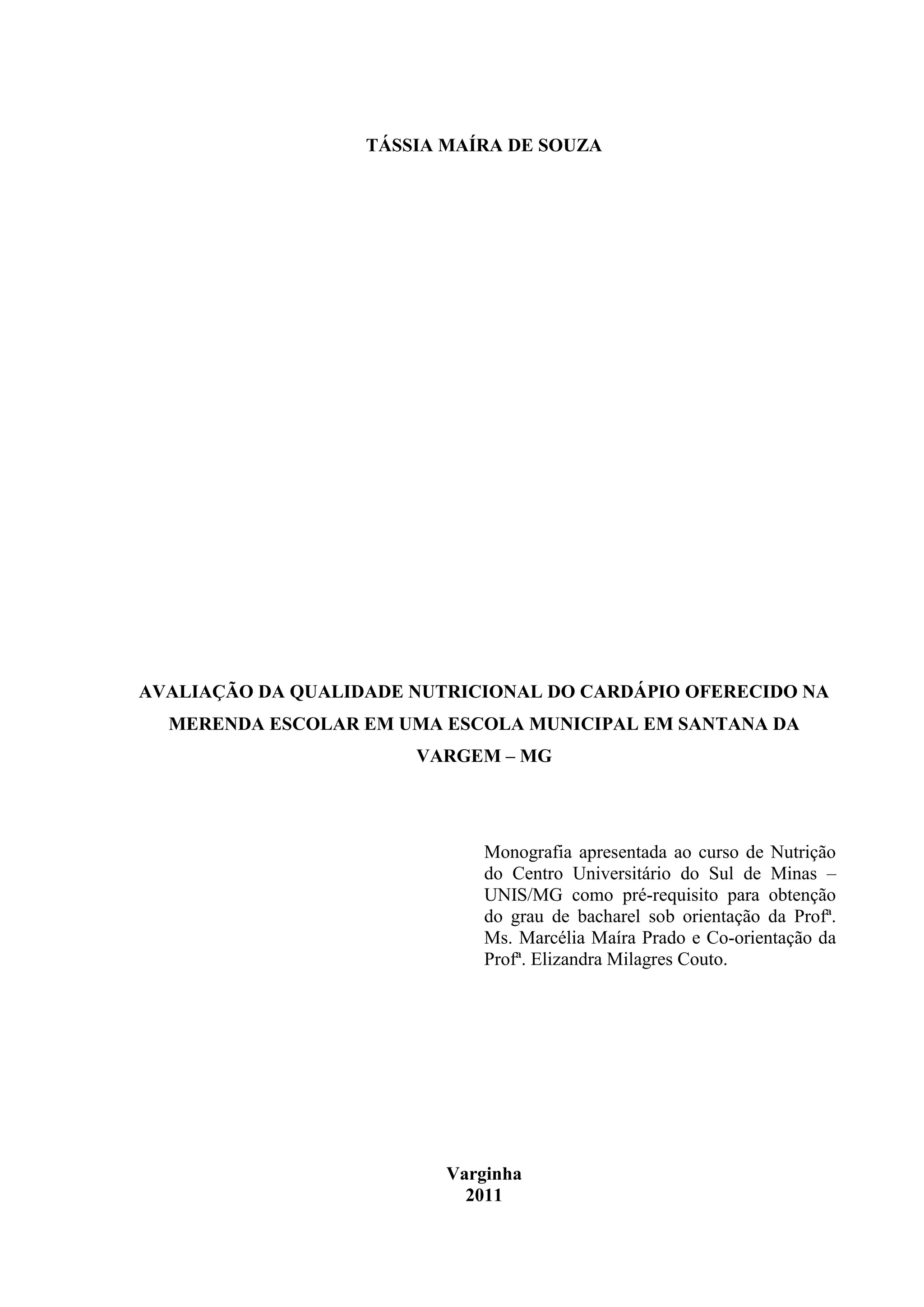 1. O documento é uma monografia apresentada por Tássia Maíra de Souza para obtenção do grau de bacharel em nutrição que avalia a qualidade nutricional do cardápio oferecido na merenda escolar de uma escola municipal em Santana da Vargem - MG.