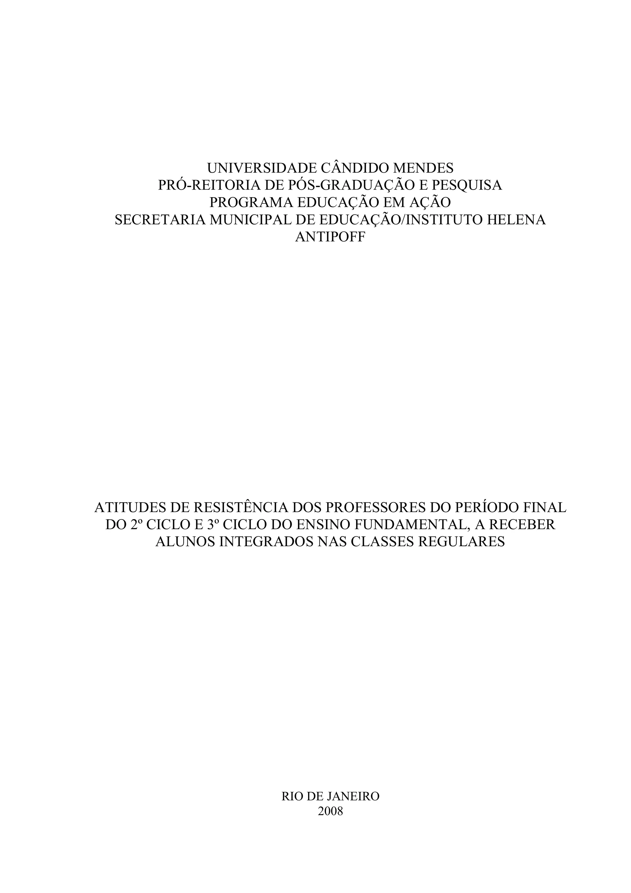 O documento apresenta uma monografia que analisa as atitudes de resistência dos professores em integrar alunos com deficiências nas classes regulares do ensino fundamental no Rio de Janeiro. A pesquisa, baseada na trajetória do ensino especial e experiências pessoais da autora, busca esclarecer as dificuldades enfrentadas por educators e propor caminhos para uma inclusão efetiva. O estudo destaca a evolução histórica e cultural do ensino especial, bem como a necessidade de se criar oportunidades iguais de aprendizagem para todos os alunos.