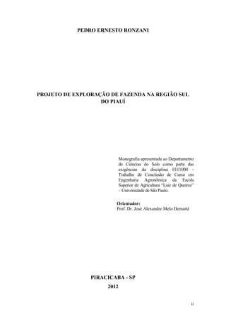 Este documento apresenta um projeto de exploração agrícola na região sul do Piauí, Brasil. Inicialmente descreve a infraestrutura e logística disponíveis na região, bem como as perspectivas dos mercados de soja e terras. Em seguida caracteriza a base física agrícola incluindo clima, solos e relevo. Por fim, realiza um mapeamento da região usando SIG para identificar áreas potenciais para agricultura e descreve uma fazenda específica em termos de solos e produção.