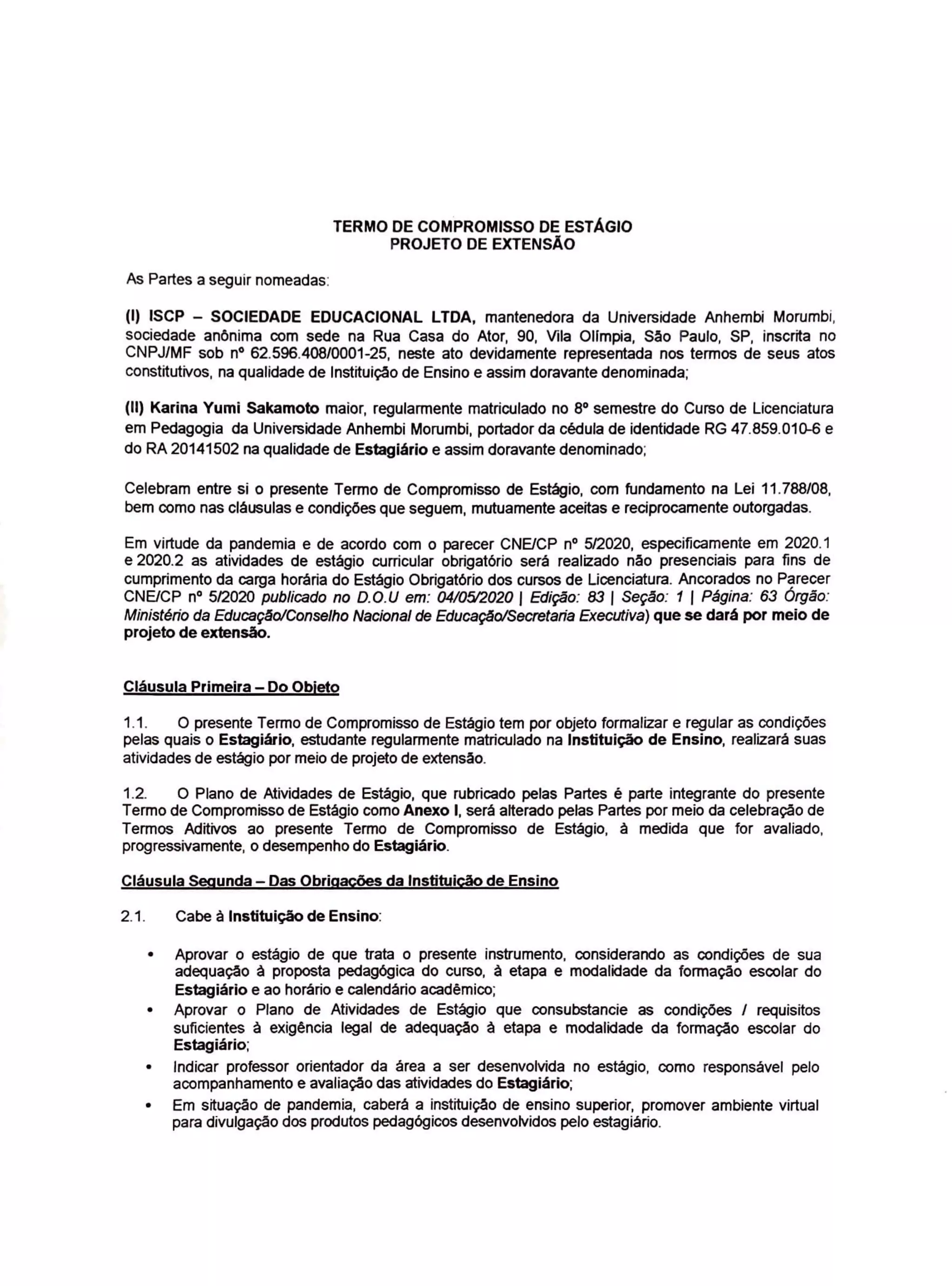 Este documento é um termo de compromisso de estágio entre uma universidade e uma estudante. Ele define as obrigações de ambas as partes, incluindo a realização das atividades de estágio por meio de projeto de extensão devido à pandemia, e estabelece que a estudante não receberá bolsa auxílio por se tratar de estágio obrigatório.