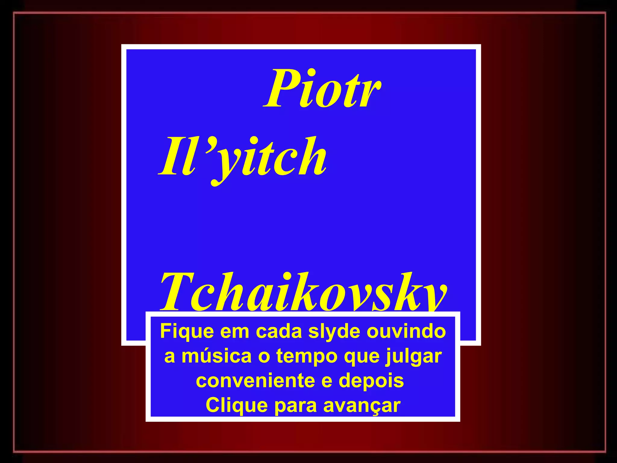 O documento apresenta a biografia do compositor russo Piotr Ilyich Tchaikovsky, destacando seus principais trabalhos como O Lago dos Cisnes, A Bela Adormecida e O Quebra-Nozes, além de detalhar sua carreira internacional e influência na música clássica.