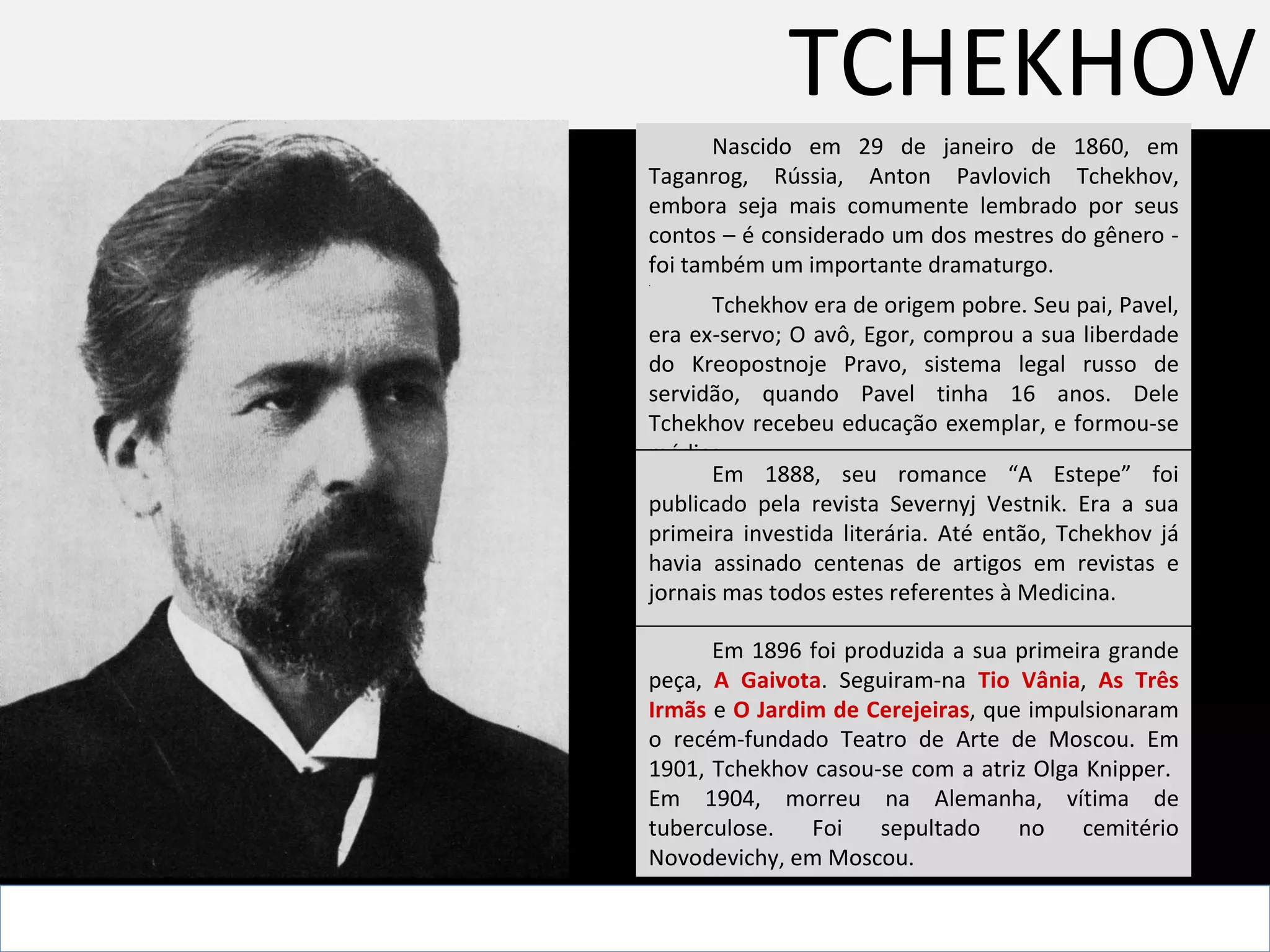2) Suas principais peças, como As Três Irmãs, Tio Vânia e O Jardim de Cerejeiras, impulsionaram o recém-fundado Teatro de Arte de Moscou.