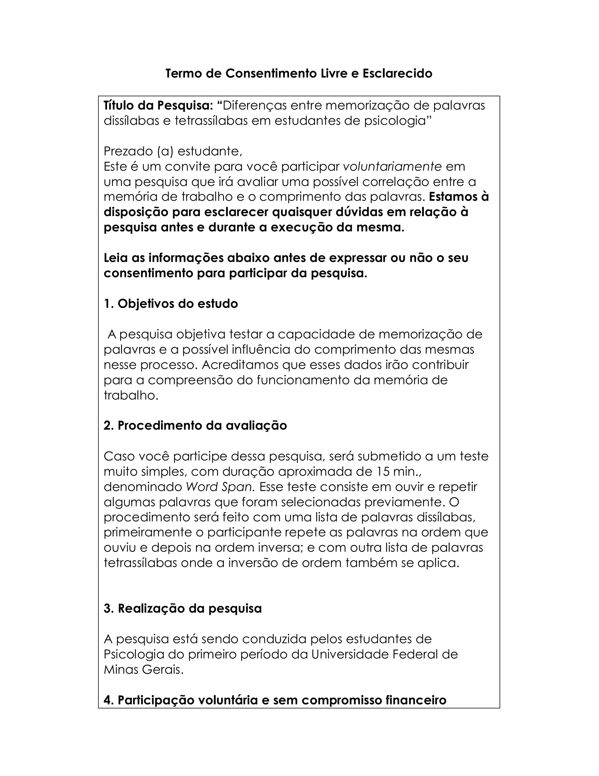Este documento descreve um estudo de pesquisa que avaliará a capacidade de memorização de palavras de diferentes comprimentos por estudantes de psicologia. Os participantes serão submetidos a um teste de repetição de palavras dissílabas e tetrassílabas. A pesquisa é voluntária e sem riscos, e os resultados serão divulgados de forma anônima para contribuir para a compreensão da memória de trabalho.