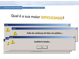 O documento fornece dicas sobre técnicas de apresentação, enfatizando a importância de se preparar bem conhecendo o assunto e a audiência, usar recursos visuais adequadamente, e falar de maneira natural e envolvente. É recomendado que o apresentador se informe sobre os expectadores, domine o conteúdo, e crie uma apresentação coerente com início, meio e fim dentro do tempo estipulado.