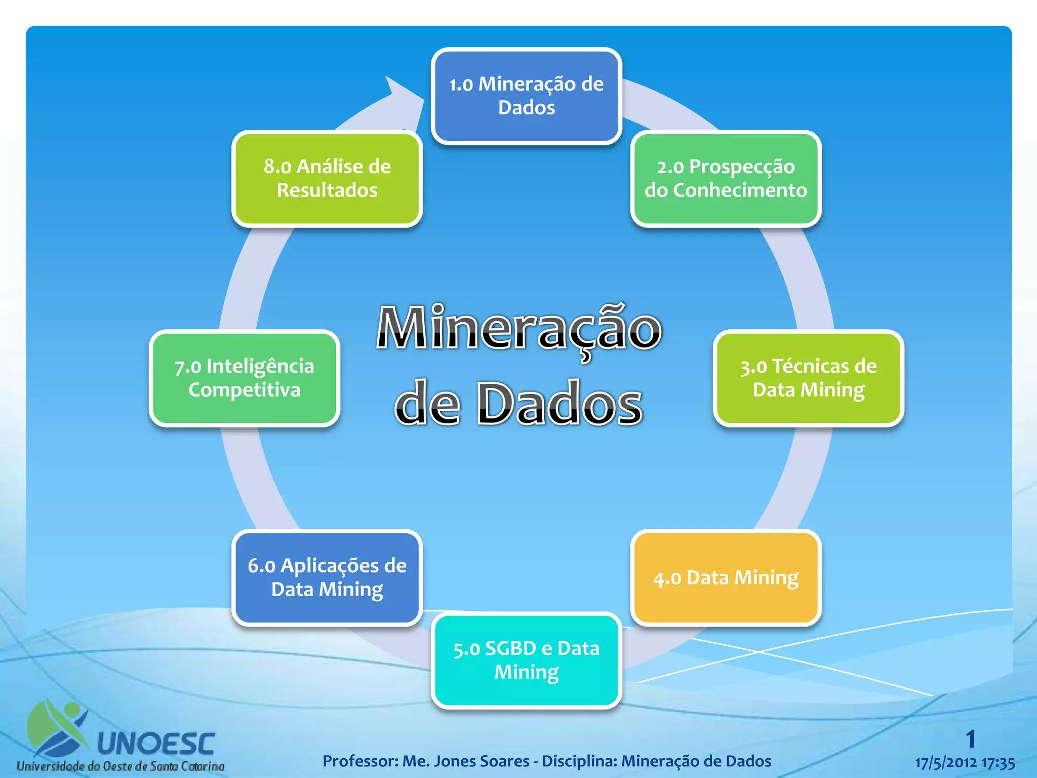 O documento discute as técnicas de mineração de dados, incluindo clusterização, classificação, associações e análises de sequências. Também aborda os desafios de pré-processamento e pós-processamento de dados e fornece exemplos de aplicações dessas técnicas.