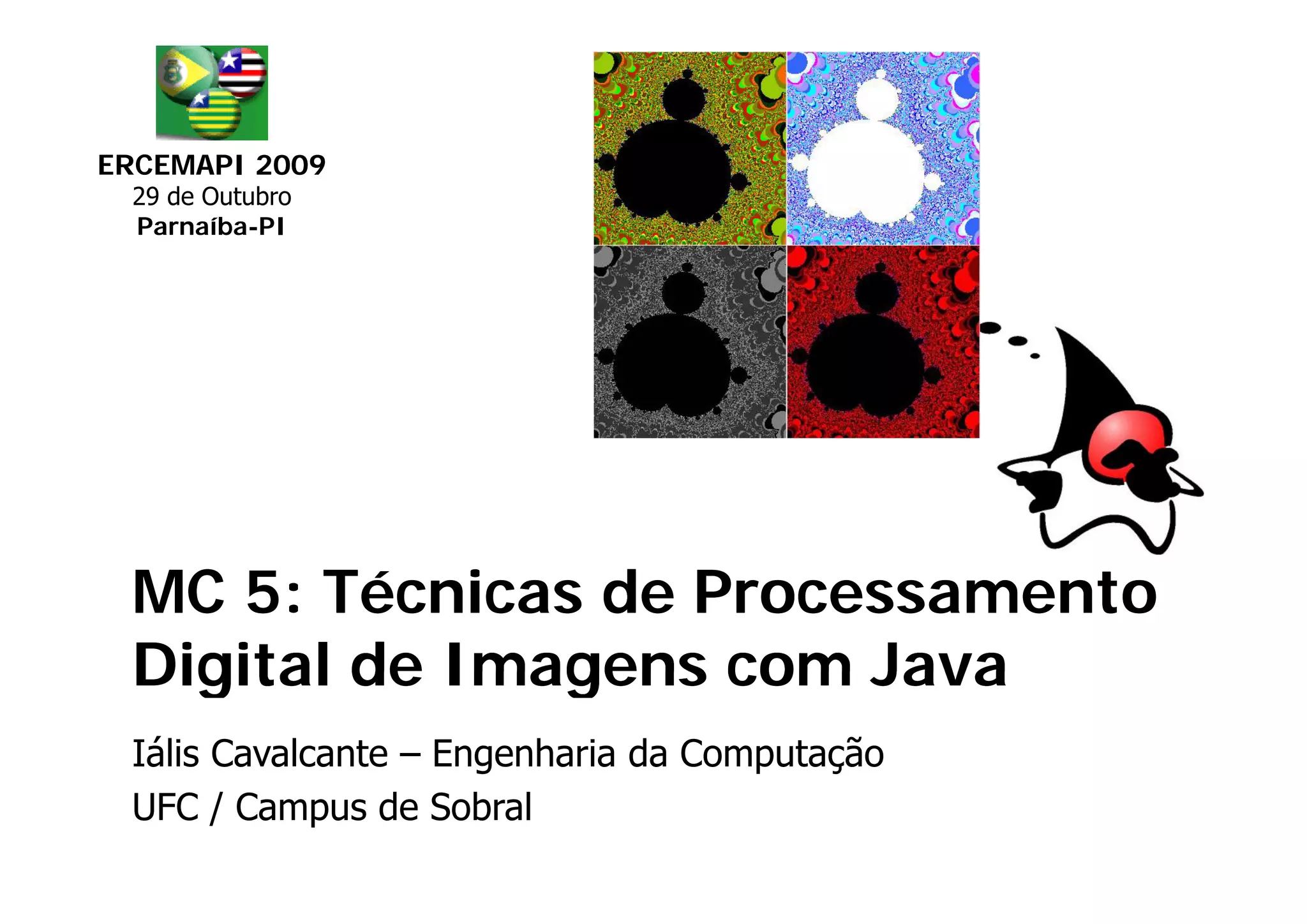 O documento aborda técnicas de processamento digital de imagens (PDI) utilizando Java, abrangendo conceitos básicos, APIs disponíveis como Java Advanced Imaging (JAI) e ImageJ, e desenvolvimento de um aplicativo simples. Ele detalha diversas técnicas PDI, incluindo realce, segmentação e morfologia matemática, além de discutir a importância e aplicações do PDI em diferentes áreas. O texto também inclui exemplos de código em Java para implementar essas técnicas.