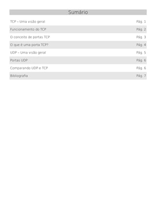 O documento fornece uma introdução aos protocolos TCP e UDP, descrevendo suas principais características e diferenças. TCP é orientado a conexão e fornece entrega confiável de dados através de confirmações, enquanto UDP é sem conexão e não garante entrega. Ambos usam números de porta para direcionar pacotes a aplicativos.