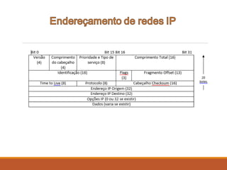 A camada de rede (camada 3) opera a Internet usando endereços IP para encaminhar pacotes de dados entre dispositivos. Cada dispositivo conectado à rede tem um endereço IP único. Existem diferentes classes de endereços IP e protocolos envolvidos no processo de transmissão de dados usando endereços IP.