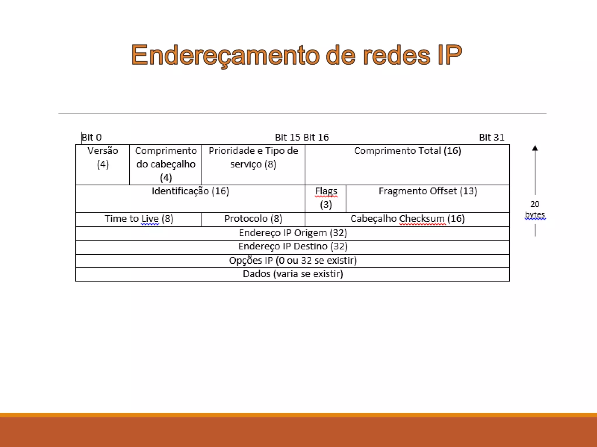 • O endereçamentode IP cobre vários aspetos, incluindo os cálculos para construir um endereço IP, as classes de endereços IP e os endereços públicos versus endereços privados. • Aprender este funcionamento proporciona um entendimento de como os dados são transmitidos através da camada 3 usando TCP/IP. • Para facilitar o roteamento de pacotes numa rede, o TCP/IP usa um endereço lógico de 32 bits. Este endereço tem de ser único para cada dispositivo na rede. • O cabeçalho da camada internet do TCP/IP é conhecido como cabeçalho IP.