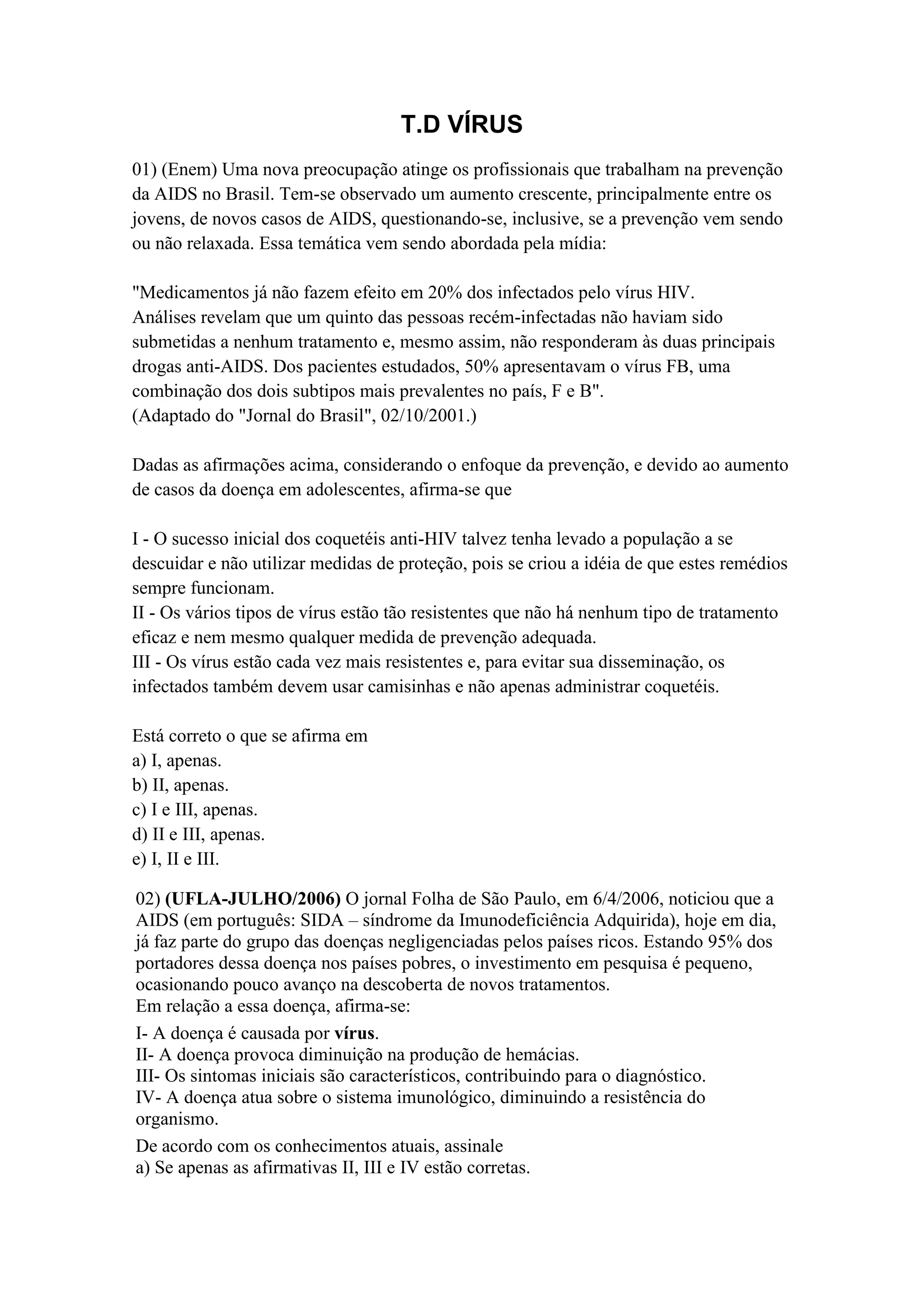 I - O sucesso inicial dos coquetéis anti-HIV talvez tenha levado a população a se descuidar e não utilizar medidas de proteção, pois se criou a idéia de que estes remédios sempre funcionam. II - Os vírus estão cada vez mais resistentes e, para evitar sua disseminação, os infectados também devem usar camisinhas e não apenas administrar coquetéis.