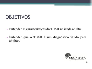 O documento discute as características do Transtorno de Déficit de Atenção e Hiperatividade (TDAH) na idade adulta. Ele define TDAH, explica seus principais sintomas de desatenção, impulsividade e hiperatividade, e destaca que é um transtorno neurobiológico que não está relacionado à inteligência ou preguiça. O documento também aborda os critérios de diagnóstico do DSM-IV e as opções de tratamento, incluindo medicação e psicoterapia cognitivo-