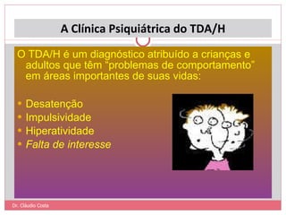 O documento discute o Transtorno do Déficit de Atenção/Hiperatividade (TDAH), incluindo sua definição, etiologia, comorbidades, diagnóstico diferencial e orientações para tratamento. O autor é um psiquiatra especializado em TDAH que fornece informações sobre a condição e recomendações para pais de crianças diagnosticadas.