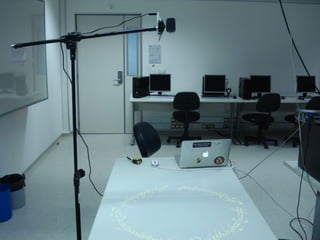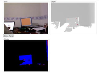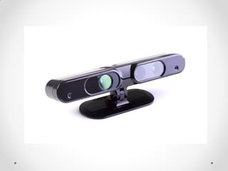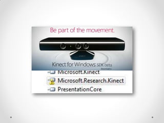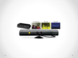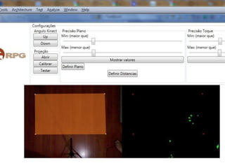 O documento apresenta uma palestra sobre a Kinect, abordando sua introdução como uma interface natural inovadora, como funciona capturando som e imagem, e exemplos iniciais de seu uso, incluindo a aplicação da realidade aumentada em jogos de RPG.