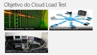 O documento discute testes de carga para medir a responsividade de sistemas e dispositivos sob condições normais e de pico. Ele fornece detalhes sobre como usar ferramentas como Visual Studio 2013 Ultimate Load Test para testar serviços web e armazenar resultados em Azure Blobs e Tables. Planejamento de testes inclui testes estáticos e aumentando sob diferentes condições de rede para garantir a escalabilidade na nuvem.