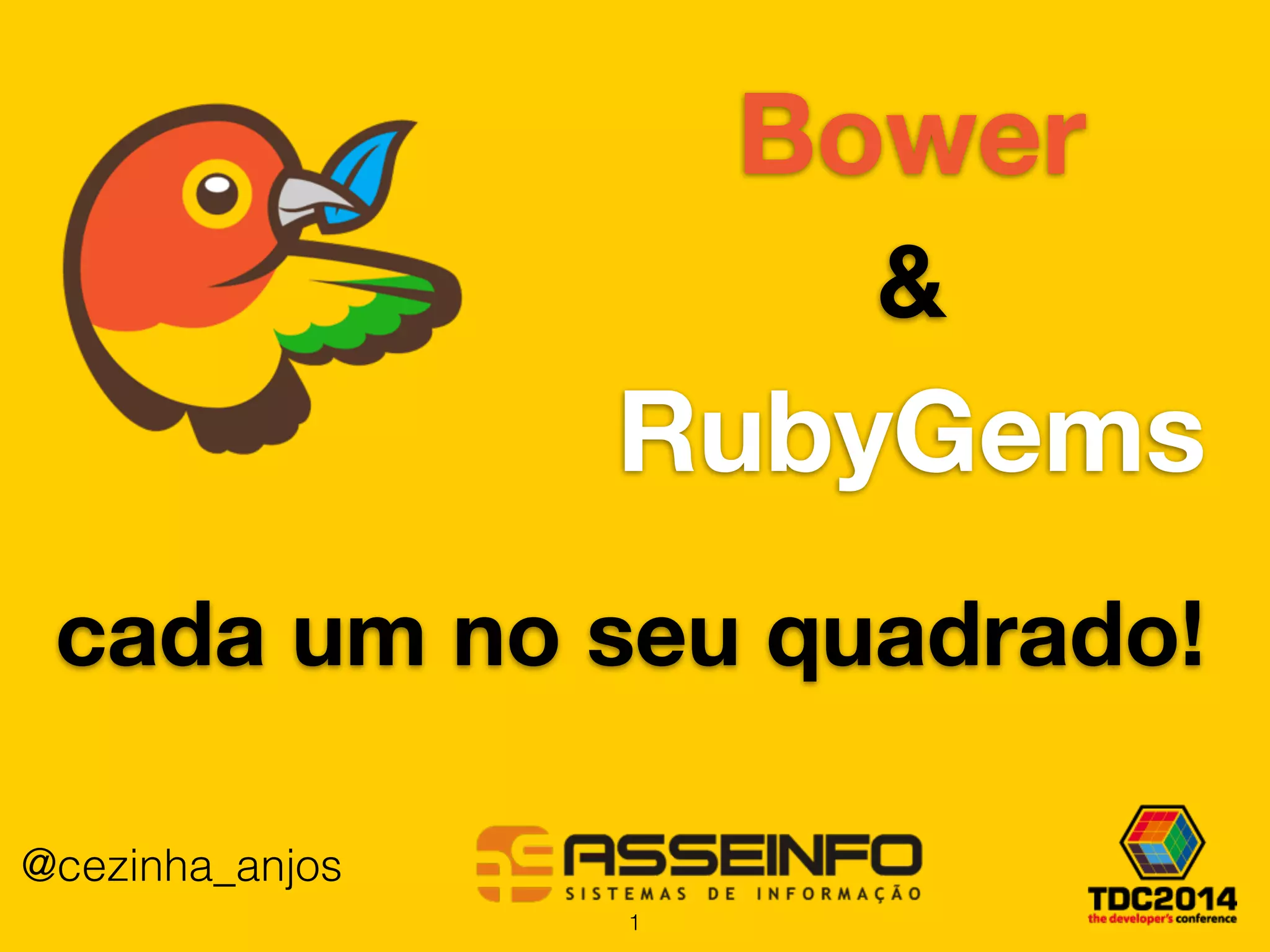 O documento discute o uso de Bower e RubyGems para gerenciamento de pacotes front-end e back-end respectivamente. Ele explica que Bower é melhor para pacotes front-end como CSS e JavaScript, enquanto RubyGems deve ser usado para código Ruby. O documento também fornece exemplos de como configurar e usar Bower em projetos Rails.