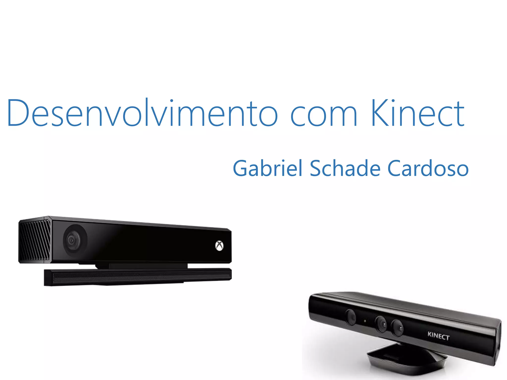 Gabriel Schade Cardoso apresenta seu trabalho com desenvolvimento utilizando o Microsoft Kinect. Ele tem experiência com C# e .NET, além de ser autor de livros sobre Kinect e Windows Phone. O documento explica como o Kinect funciona para reconhecimento de voz, mãos e postura através de sensores e fluxos de esqueleto, bem como técnicas para detecção de gestos.