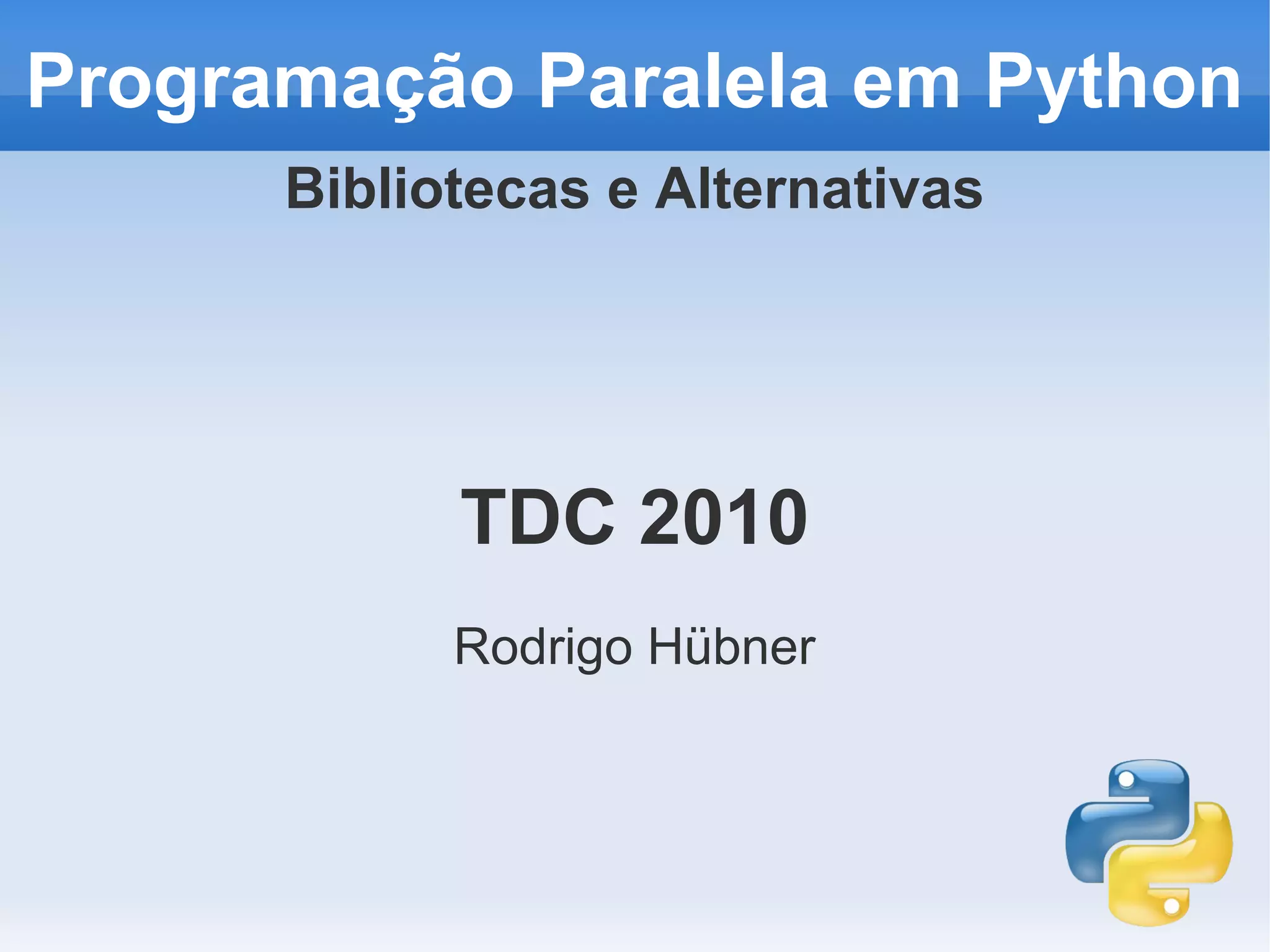 O documento discute programação paralela em Python, apresentando bibliotecas e alternativas como threading, multiprocessing, Parallel Python e MPI for Python. Exemplos mostram como esses módulos podem ser usados para executar tarefas em paralelo em Python.