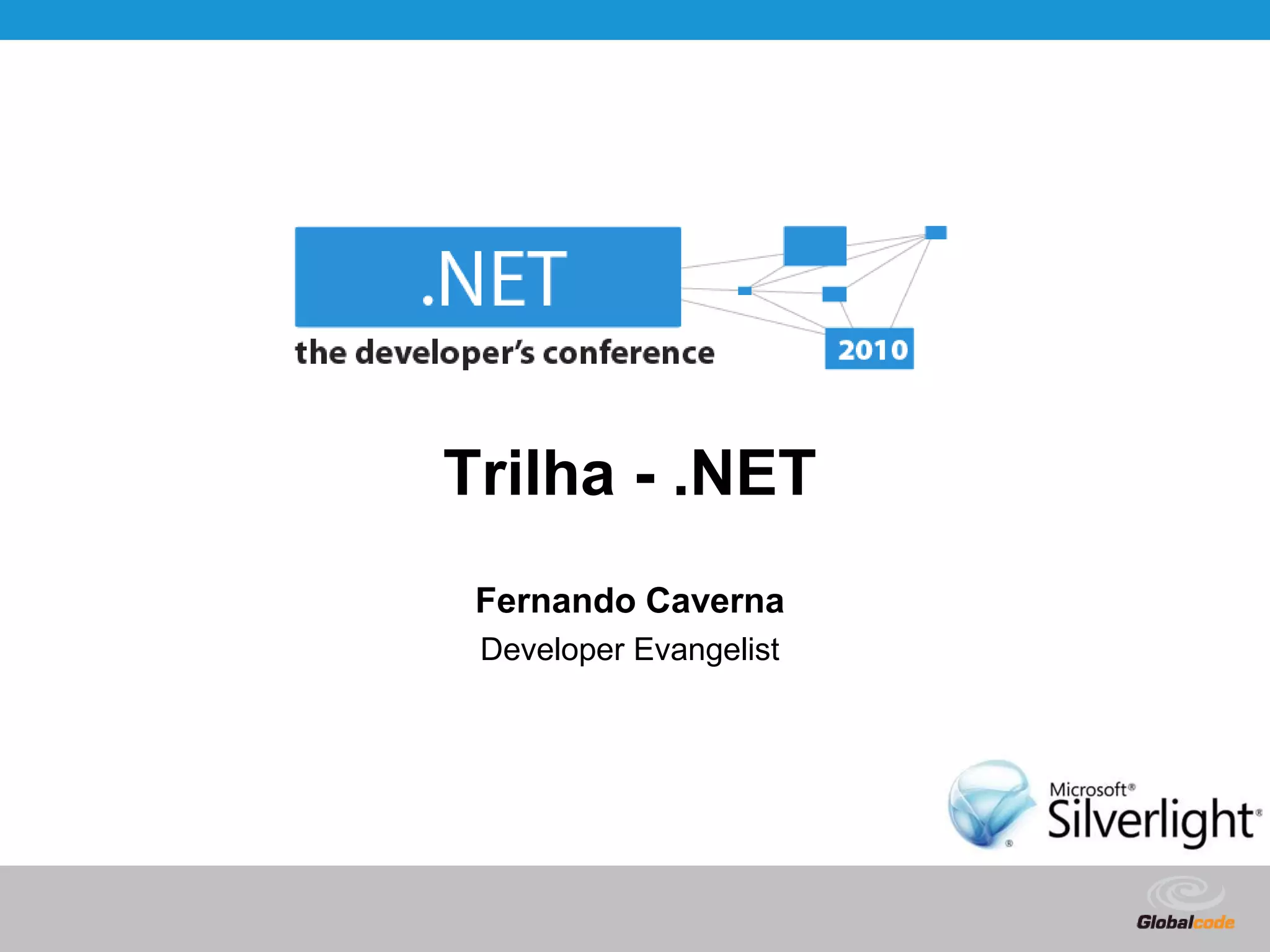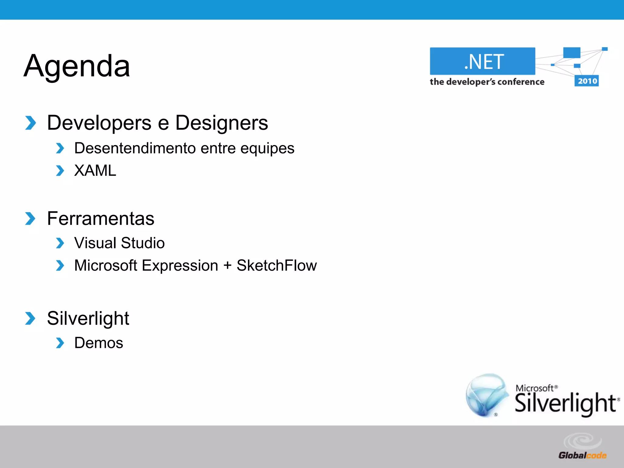 O documento discute a agenda de uma apresentação sobre .NET. A apresentação abordará a comunicação entre desenvolvedores e designers, XAML, ferramentas como Visual Studio e Microsoft Expression, Silverlight e demonstrações.