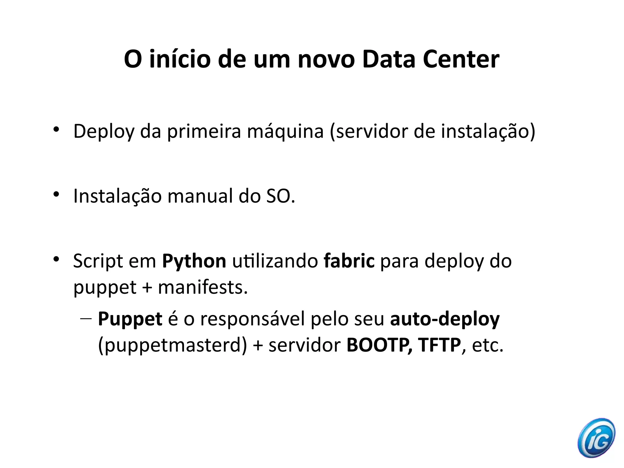 O documento descreve como o uso de ferramentas como Python, Puppet, Cobbler, Func e Collectd permitem automatizar e gerenciar o deploy e a operação de um novo data center de forma remota e automatizada. O Control Station é apresentado como uma interface unificada para visualizar e gerenciar as informações coletadas por essas ferramentas.