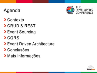 O documento discute a adoção de microserviços e event sourcing em larga escala por uma plataforma bancária. Apresenta os desafios de CRUD e arquitetura REST, e como event sourcing, CQRS e arquitetura baseada em eventos ajudam a atender requisitos como auditoria, desempenho e consistência. Exemplifica as abordagens com um caso de e-commerce e discute tecnologias, desafios e conclusões.