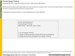 O documento fornece informações sobre Process Design Thinking e Gestão de Processos de Negócio. Apresenta conceitos como governança e gestão de processos, tipos de processos, ciclo de vida de processos e áreas de conhecimento em gestão de processos de acordo com o guia BPM CBOK. Também discute os desafios do novo contexto de negócios e a necessidade de ir além de padrões e frameworks para promover a inovação nos processos.