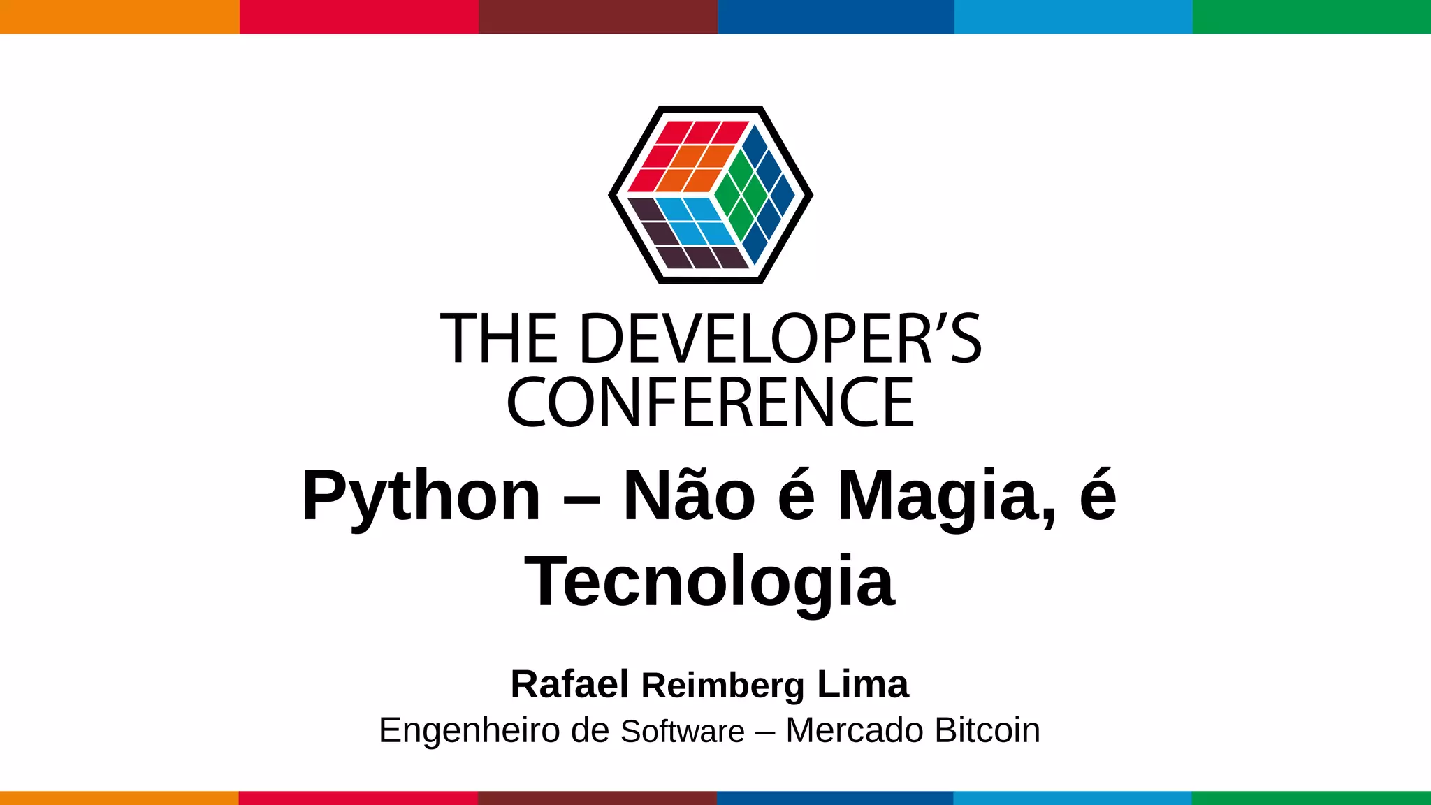 O documento discute conceitos fundamentais da linguagem Python, incluindo suas qualidades como flexível e orientada a objetos, técnicas como mocks, design patterns, monkey patching e context managers, e recursos como decorators, duck typing e métodos mágicos especiais.
